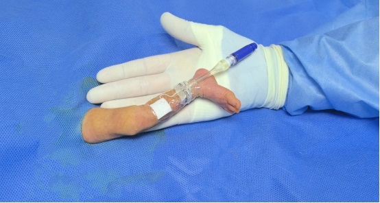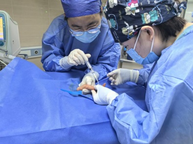 為保障患兒安全,科主任、護(hù)士長、新生兒PICC?谱o(hù)士通過對(duì)患兒治療過程的全面評(píng)估,深入探討分析,決定為患兒行PICC置管術(shù)。取得家屬同意后,經(jīng)過護(hù)理團(tuán)隊(duì)的充分準(zhǔn)備和細(xì)致評(píng)估,從操作者到配合者進(jìn)行了合理分工,置管全程把控細(xì)節(jié),耗時(shí)30分鐘,將僅1.9Fr(約0.6mm)的導(dǎo)管送入理想位置,成功為患兒實(shí)施PICC置管術(shù),經(jīng)床旁X線攝片顯示導(dǎo)管尖端位于最佳位置。術(shù)后患兒情況穩(wěn)定。