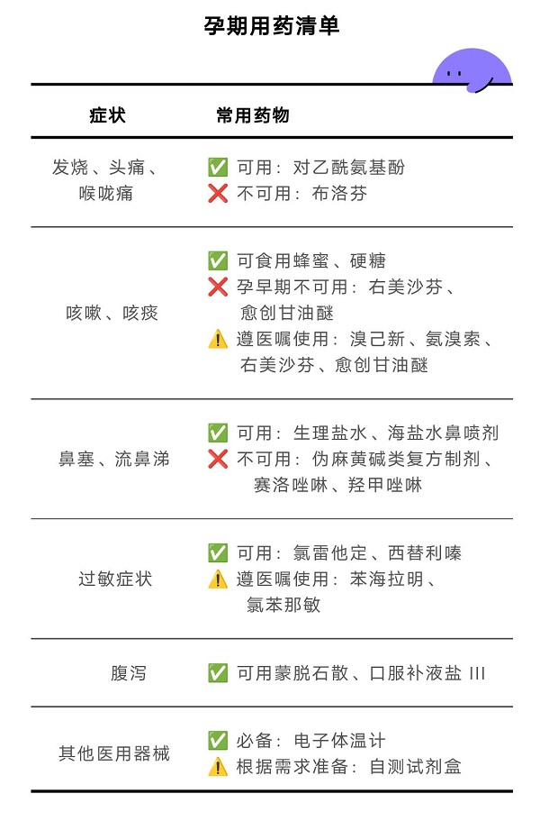 另外,我們整理了針對新冠不同癥狀的常見藥物,并給出孕期是否可用的建議,大家可以參考。