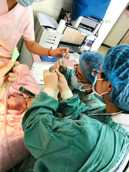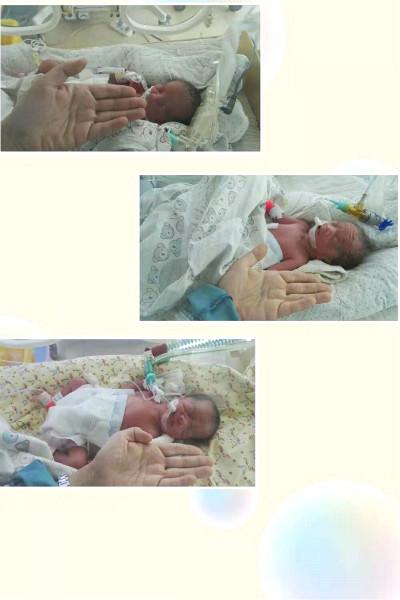 28周早產(chǎn)兒各臟器發(fā)育還極不成熟,特別是肺缺乏肺表面活性物質(zhì),出生后很可能因?yàn)椴粫?huì)哭、沒有呼吸出現(xiàn)窒息,全身皮膚脂肪薄,很容易因?yàn)闊崃縼G失發(fā)生硬腫癥。很快產(chǎn)房里聚集了多名經(jīng)驗(yàn)豐富的婦產(chǎn)科醫(yī)生、新生兒醫(yī)生和助產(chǎn)士,各種搶救設(shè)備及新生兒重癥監(jiān)護(hù)室里的保溫箱及呼吸機(jī)也都準(zhǔn)備完畢。有30多年工作經(jīng)驗(yàn)的婦產(chǎn)科主任陳文親自上陣,新生兒重癥監(jiān)護(hù)室主任楊愛琳主任醫(yī)師陪產(chǎn)全程。隨著羊膜囊的娩出及刺破,一個(gè)巴掌大小、皮膚菲薄、全身青紫的寶寶誕生了,首先給予寶寶T組合正壓通氣,兒科牛俊紅醫(yī)師迅速為他氣管插管,插管成功。第二個(gè)寶寶即將娩出,兩者出生間隔3分鐘,兒科醫(yī)師張彤迅速將長子轉(zhuǎn)入新生兒重癥監(jiān)護(hù)室溫箱內(nèi)呼吸機(jī)機(jī)械通氣治療,第二個(gè)、第三個(gè)寶寶在出生后也被以最快的速度氣管插管呼吸支持順利轉(zhuǎn)入新生兒重癥監(jiān)護(hù)室。三個(gè)寶寶的體重只有1.2kg、1.2kg、1.0kg。