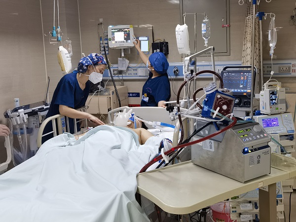 根據(jù)患者臨床表現(xiàn)、查體結(jié)果,結(jié)合病史和相關(guān)醫(yī)學(xué)檢查,劉延科明確診斷為“暴發(fā)性心肌炎、心源性休克、急性呼吸衰竭”等嚴(yán)重疾病,立即為患者實(shí)施鎮(zhèn)痛、氣管內(nèi)插管等治療。然而,高先生的病情遠(yuǎn)比想像中的兇險(xiǎn),心率和血氧飽和度仍持續(xù)下降,劉延科根據(jù)多年臨床經(jīng)驗(yàn)判斷若無(wú)有效干預(yù)措施,患者將在極短時(shí)間內(nèi)發(fā)生心搏停止而死亡,有實(shí)施緊急ECMO治療的指證。在與患者家屬進(jìn)行病情溝通后,很快征得了家屬的理解和同意,為患者實(shí)施緊急ECMO治療。