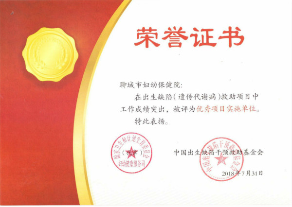 在出生缺陷(遺傳代謝。┚戎(xiàng)目中成績突出,聊城市婦幼保健院被評為優(yōu)秀項(xiàng)目實(shí)施單位。