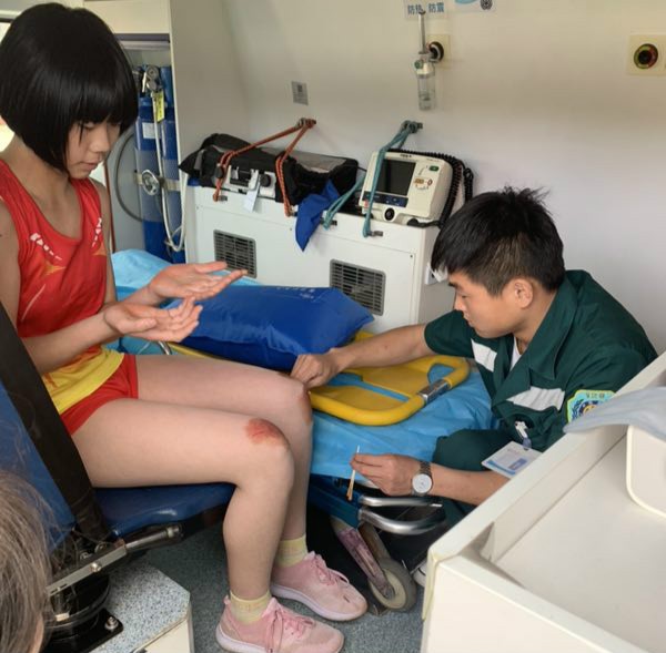 我院急診科高度重視此次醫(yī)療保障工作,救護車上配備了血壓計、血糖儀、進口心電圖、電除顫儀和呼吸機,還有氧氣供給裝置等先進的儀器設備和充足的藥品,并做好了各種應急預案。運動會現(xiàn)場氛圍猶如夏季的焦陽,如火如荼,運動員各個精神飽滿、奮勇爭先,現(xiàn)場觀眾熱情高漲。就在大家為獲勝的運動員歡呼時,一名運動員突然暈倒在會場上,我院急診科醫(yī)護人員迅速趕到,并對該名運動員測量生命體征,評估病情,在確定一切正常后,醫(yī)護人員給予該名運動員吸氧,觀察,經(jīng)過四十多分鐘的觀察治療,該名運動員恢復正常,并順利返回了運動場。剛處理完上一名患者,此時又有一名多處擦傷的運動員被抬上救護車,醫(yī)護人員立即進行相應處置。本次保障任務,共處置包括擦傷、扭傷、韌帶拉傷等損傷情況的患者十余名,確保了運動會的順利舉行。