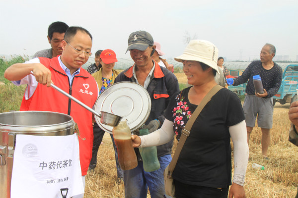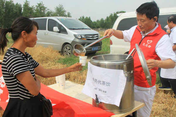 “大家辛苦了!這是醫(yī)院免費為大家準(zhǔn)備的綠豆湯,里面還添加了薄荷、白茅根、金銀花,主要功效是清熱、解暑,大家快來嘗嘗吧!”在給群眾送去清涼的同時,我院醫(yī)務(wù)人員還向群眾講解夏季常見疾病及預(yù)防措施,并針對中暑的防治進(jìn)行現(xiàn)場解說,為廣大村民送去貼心的服務(wù),受到了農(nóng)民群眾的熱烈歡迎。醫(yī)務(wù)人員們囑托農(nóng)民朋友,天氣炎熱,一定要做好防暑降溫,高溫天氣要注意勞逸結(jié)合,注意飲食衛(wèi)生健康,保重身體。“天熱,喝水就多一些。以前天一熱,我就希望能多喝點綠豆湯,現(xiàn)在醫(yī)院為我們送來了中藥代茶飲,累了不僅可以喝到避暑綠豆湯,在綠豆湯里還加上了降火中藥,中心醫(yī)院想得太周到了!真是太感謝了!”一旁的王大爺高興地說。