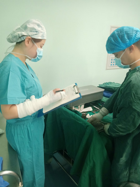 劉延雪今天是巡回護(hù)士,不,不只是今天,而是接下來(lái)的一段時(shí)間。不是對(duì)工作的挑揀,是因?yàn)樗觳采系男卵b備——石膏。原來(lái),她的手已經(jīng)疼了好幾天,手腕處鼓起了包。昨天下班后,她去骨科找了醫(yī)生,被診斷為:下尺橈關(guān)節(jié)處韌帶斷裂引起下尺橈關(guān)節(jié)脫位,外加手腕處腱鞘囊腫,必須進(jìn)行關(guān)節(jié)復(fù)位加囊腫切除?紤]到科室已有2名護(hù)理人員請(qǐng)了病假,科室現(xiàn)在人員少、任務(wù)重,所有護(hù)理人員都在負(fù)重前行,劉延雪要求骨科醫(yī)師進(jìn)行保守治療,并且在進(jìn)行支具固定時(shí)讓醫(yī)生將支具修剪成了可以握筆的形狀,這樣可以不耽誤巡回護(hù)士崗位的工作。這位26歲的姑娘經(jīng)過(guò)了3年的手術(shù)室生涯由弱女子變成了大局為重不矯情的女漢子。