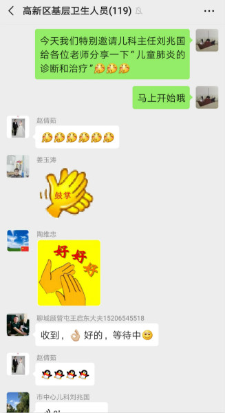 我院兒科主任劉兆國和心內(nèi)科主治醫(yī)師姚理娜相繼在微信群里,采用微信語音與視頻相結合的形式,為高新區(qū)的鄉(xiāng)村醫(yī)生們開展了主題為“兒童肺炎的診斷和治療”及“胸悶的相關知識”的微信課堂講座。課上,劉兆國主任通過兒童肺炎胸片對比進行講解,詳細講解了根據(jù)兒童表現(xiàn)出的癥狀如何判斷和診療,并對各種癥狀進行用藥指導。姚大夫則針對中老年人胸悶常見的原因和治療原則進行了講解。課后,高新區(qū)的各位鄉(xiāng)村醫(yī)生就講座內(nèi)容進行了交流與互動。大家紛紛夸贊微信課堂的講課模式,讓大家不出門就可以學到專業(yè)醫(yī)療知識。