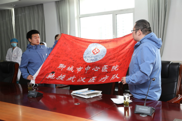 隨后,醫(yī)院為他們舉行了隆重的歡迎儀式。儀式上,院長助理高明忠宣讀了《關(guān)于號召全體職工向赴鄂人員學(xué)習(xí)的通知》,隨后,閆冉作為赴鄂人員代表匯報了參加抗擊疫情的工作情況和心靈感悟,并向醫(yī)院捐贈了從武漢帶來的寶貴禮物——《山東省第八批援鄂醫(yī)療隊前線手記》和一枚山東省第八批援鄂醫(yī)療隊的紀(jì)念徽章。