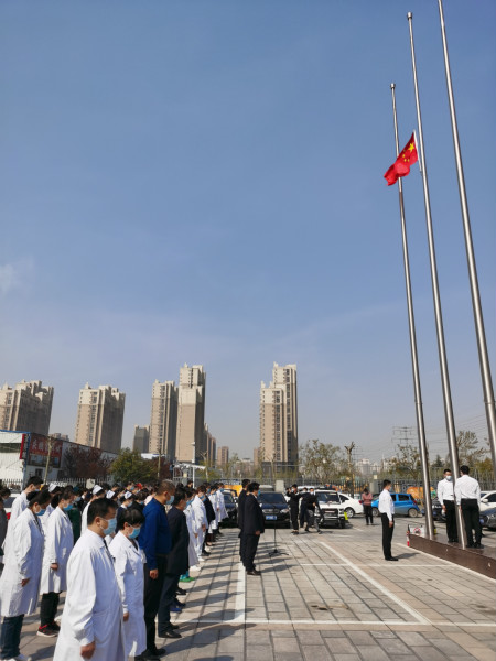 參加悼念活動(dòng)的醫(yī)院干部職工著統(tǒng)一的隔離衣、正裝,按照各自的位置站好。首先舉行升國旗儀式,由我院國旗護(hù)衛(wèi)隊(duì)邁著鏗鏘有力的步伐,昂首挺胸,護(hù)送國旗入場(chǎng)。“升國旗,奏唱國歌,行注目禮!”隨著雄壯激昂的旋律響起,全體人員齊目仰望,共唱國歌。鮮艷的五星紅旗冉冉升起,肅穆莊嚴(yán),迎風(fēng)飄揚(yáng)。國旗升起后舉行下半旗儀式,此時(shí),防空警報(bào)聲響徹城市上空,大家在肅穆的氣氛中向新冠肺炎疫情犧牲烈士和逝世同胞默哀3分鐘。