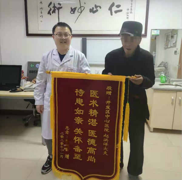 82歲的李大爺是我院神經(jīng)內(nèi)科的“老病號”了,半月前因反復(fù)頭暈、頭悶伴不思飲食、惡心、嘔吐、肢體活動不利、記憶力減退、癡呆等,嚴(yán)重影響生活,再次入住我院神經(jīng)內(nèi)科。趙弘揚主治醫(yī)師接診后認(rèn)真為他進行體格檢查,結(jié)合患者既往病史及輔助檢查結(jié)果,給予針對性地治療與護理,患者頭暈癥狀大大緩解。住院期間,趙弘揚醫(yī)生每天去李大爺病床前詢問病情,對于李大爺及家屬提出的問題耐心解答。他的舉動令李大爺特別感動,特地制作了“醫(yī)術(shù)精湛 醫(yī)德高尚 待患如親 關(guān)懷備至”的錦旗送到趙弘揚醫(yī)師手上,以表達自己的感激之情。