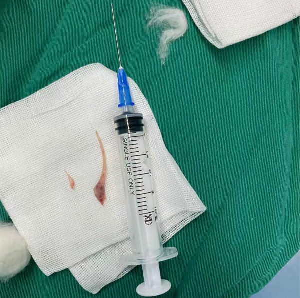 耳鼻喉科主任李國(guó)勇與王寒醫(yī)師聽(tīng)了患者敘述,完善相關(guān)操作前檢驗(yàn)后,立即行電子鼻咽喉鏡檢查,發(fā)現(xiàn)在左側(cè)梨狀窩處一白色魚(yú)刺樣異物漏出,較硬,隨著患者的吞咽動(dòng)作此魚(yú)刺已扎入梨狀窩,導(dǎo)致左側(cè)梨狀窩粘膜及會(huì)厭、環(huán)后處粘膜腫脹明顯,魚(yú)刺漏出部分較小,周圍組織腫脹致魚(yú)刺暴露欠佳,且患者比較緊張,喉鏡配合度欠佳,于是決定急癥安排手術(shù)。因該位置為頸內(nèi)、外動(dòng)靜脈走形處,并神經(jīng)血管較多、解剖結(jié)構(gòu)復(fù)雜,稍有不慎即可發(fā)生大出血,嚴(yán)重者可致休克、危及生命,為明確魚(yú)刺大小、穿行部位,急行頸部CT檢查,提示咽喉部高密度影,考慮異物,約長(zhǎng)3.7cm。經(jīng)過(guò)排除手術(shù)禁忌癥,遂緊急聯(lián)系手術(shù)室,安排當(dāng)日行全麻下喉異物取出術(shù)。經(jīng)口下喉鏡,放支撐架,暴露梨狀窩,見(jiàn)左側(cè)梨狀窩粘膜腫脹,異物鉗撥開(kāi)、辨認(rèn),見(jiàn)一質(zhì)硬魚(yú)刺,經(jīng)過(guò)探查,發(fā)現(xiàn)魚(yú)刺穿過(guò)梨狀窩貫穿于會(huì)厭與咽側(cè)壁。兩端都刺入組織內(nèi)的魚(yú)刺,極為少見(jiàn)且扎入位置之深。王寒醫(yī)師使用異物鉗慢慢活動(dòng)魚(yú)刺的另一頭,見(jiàn)魚(yú)刺頭漏出后,順勢(shì)將其拔出,見(jiàn)一長(zhǎng)約4cm的魚(yú)刺,手術(shù)順利結(jié)束;颊咔逍押,自訴癥狀減輕,觀察1天后無(wú)特殊不適,順利出院。