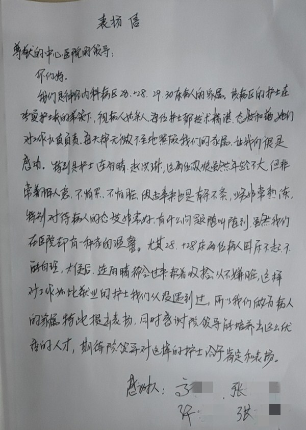 原來(lái)他們是神經(jīng)內(nèi)科28床、+28床、29床、30床的患者家屬,為了感謝神經(jīng)內(nèi)科的護(hù)士們對(duì)家屬的細(xì)心照顧,同病室的四位患者商量后一起寫(xiě)了這封表?yè)P(yáng)信。“你們醫(yī)院是真的好,護(hù)士經(jīng)常來(lái)病房看我老伴,還教我很多專(zhuān)業(yè)的知識(shí),之前我覺(jué)得自己夠?qū)I(yè)了,這回住院又學(xué)到了很多新知識(shí),真是謝謝你們啊。”28床患者家屬高大爺感動(dòng)地說(shuō)。