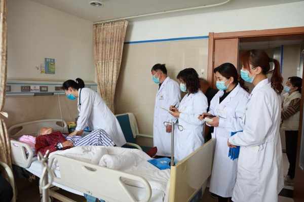“20床患者因‘反復(fù)胸悶、胸痛半年,再發(fā)1周’入院……入院后查肌鈣蛋白升高,結(jié)合心電圖表現(xiàn),胸痛癥狀,診斷為冠心病、急性非ST段抬高型心肌梗死。心肌梗死的診斷標準,目前采用1+1模式……”這是我院心內(nèi)科帶教老師姚理娜在查房時對前來參加培訓的第五期基層衛(wèi)生人員講解的內(nèi)容。