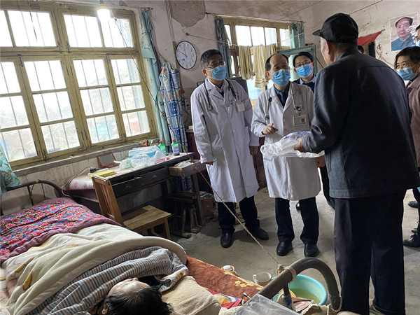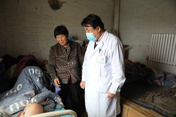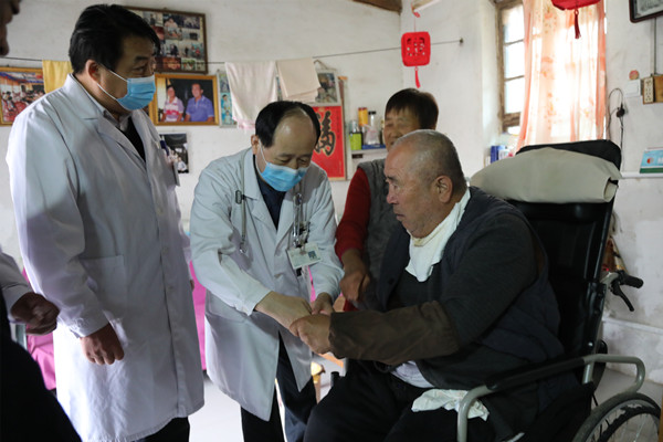 當(dāng)天下著小雨,我院黨委委員、副院長(zhǎng)劉慶來帶領(lǐng)綜合內(nèi)科副主任醫(yī)師谷圣常,骨科副主任醫(yī)師劉中克,兒童保健部部長(zhǎng)、主任醫(yī)師韓永才一行組成的專家團(tuán)隊(duì),在啟動(dòng)儀式后,帶上聽診器和愛心藥箱,深入到長(zhǎng)期臥床的五位患者家中,詢問患者身體狀況,為患者進(jìn)行了查體,指導(dǎo)患者日常護(hù)理注意事項(xiàng),并對(duì)用藥情況進(jìn)行指導(dǎo)。第一家入戶走訪的是因患腦梗已經(jīng)臥床5年、生活不能自理的95歲的老黨員袁爺爺家,他85歲的老伴因腦梗生活半自理也需要人照料。“因?yàn)槭裁丛蚺P床的啊?得這個(gè)病多長(zhǎng)時(shí)間了,最近身體有沒有不舒服?”將愛心藥箱送給老人的家人后,專家團(tuán)隊(duì)詢問了兩位老人的近況并進(jìn)行了身體檢查,叮囑他們的家人:“老人的身體還不錯(cuò),天氣好的時(shí)候帶老人出去活動(dòng)活動(dòng),避免出現(xiàn)褥瘡。”