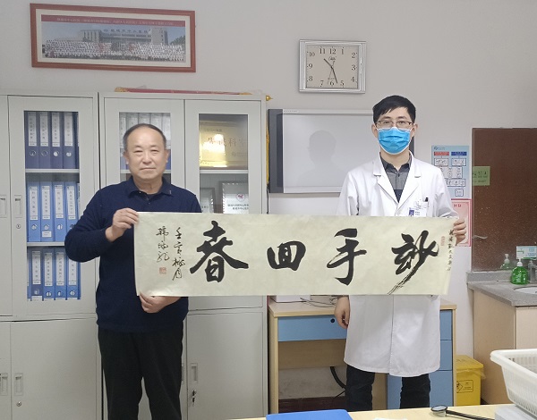10月25日上午,我院心內(nèi)科醫(yī)生辦公室正上演著溫馨的一幕,一名患者家屬將一幅寫有“妙手回春”的書法字畫交到楊勝凱醫(yī)生的手中,“醫(yī)生,請(qǐng)您收下我送您的一片心意,感謝您醫(yī)治好了我的母親。這是我自己寫的幾個(gè)字‘妙手回春’,您當(dāng)之無(wú)愧啊……”簡(jiǎn)單而溫暖的字眼,道出了患者及家屬對(duì)我院醫(yī)護(hù)人員濃濃的感激之情。
