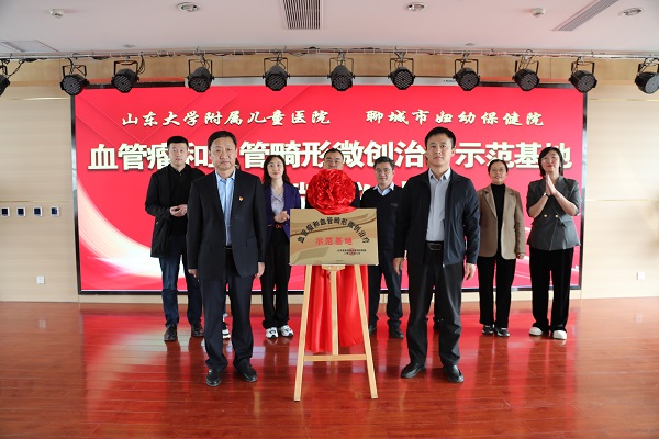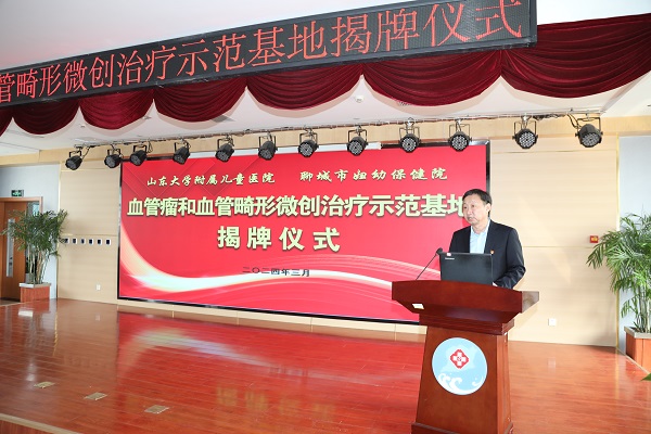 隨后,山東大學(xué)附屬兒童醫(yī)院黨委委員、副院長(zhǎng)郭磊和聊城市婦幼保健院(聊城市中心醫(yī)院)黨委書(shū)記郭敬春為山東省血管瘤和血管畸形微創(chuàng)治療示范基地揭牌,兩家醫(yī)院相關(guān)負(fù)責(zé)人共同上臺(tái)見(jiàn)證了揭牌儀式。