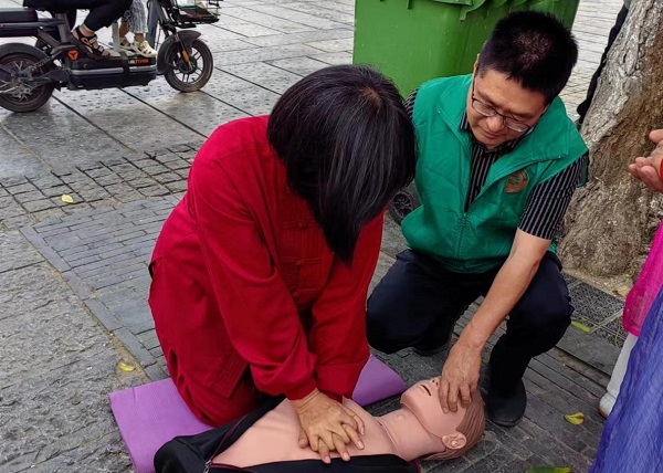 活動中,聊城市婦幼保健院急診科王建民大夫向在場群眾現(xiàn)場培訓急救知識,他用通俗易懂的語言向居民講解如何最有效地利用“黃金救命時間”施救,重點對海姆立克急救法、心肺復蘇的動作要領(lǐng)、急救包扎等內(nèi)容進行分析講解。理論講解結(jié)束后,王建民利用模擬人模型對心肺復蘇的標準動作及流程進行生動規(guī)范的同步演示,并指導居民進行實操,讓居民系統(tǒng)全面地學習救護知識和急救技能。