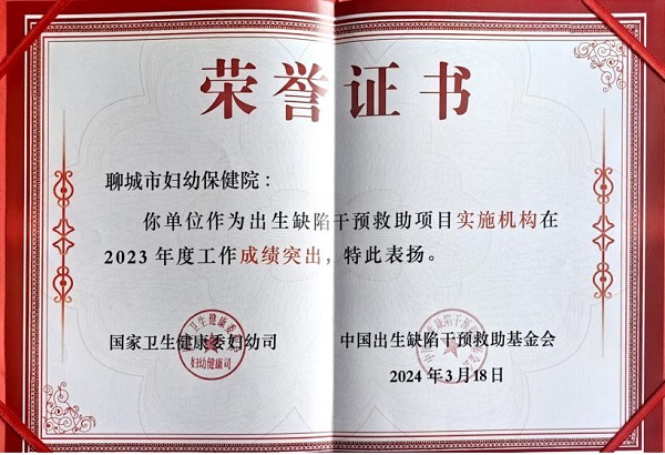 3月18日 聊城市婦幼保健院被評為“2023 年度出生缺陷干預(yù)救助項目成績突出實施機構(gòu)”。