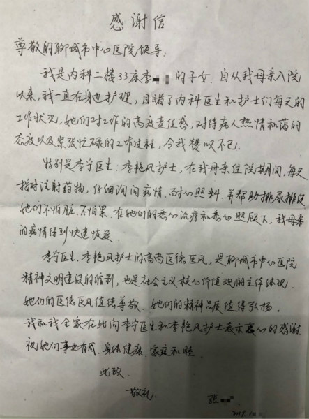 “李寧醫(yī)生、李艷風(fēng)護士的高尚醫(yī)德醫(yī)風(fēng),是聊城市中心醫(yī)院精神文明建設(shè)的縮影,也是社會主義核心價值觀的主體體現(xiàn),他們的醫(yī)德醫(yī)風(fēng)值得尊敬,他們的精神品質(zhì)值得弘揚。”近日,我院綜合內(nèi)科患者李大娘的子女將一封感謝信送至科室,以表達對科室醫(yī)護人員的感謝。