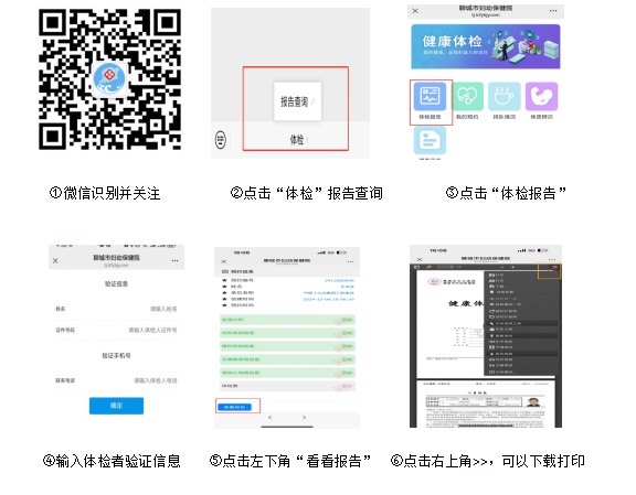 微信搜索“聊城市中心醫(yī)院體檢中心”公眾號或掃描識別下方二維碼并關(guān)注,點擊“體檢”,選擇“報告查詢”,點擊“體檢報告”,輸入體檢者姓名、身份證號、手機號,點擊“確定”,選擇所需要查看的報告,點擊左下角“查看報告”即可查看電子報告,點擊右上角“>>”符號,下載PDF版,可自行轉(zhuǎn)發(fā)打印。